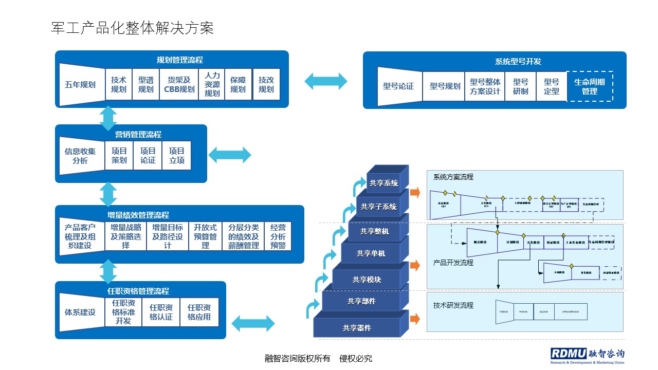 1. 通過劃分軍品、民品,建立預(yù)研、產(chǎn)品線和CBB研發(fā)部門及解決方案部(型號(hào)),實(shí)現(xiàn)核心技術(shù)支撐核心產(chǎn)品和貨架,核心產(chǎn)品支撐解決方案的產(chǎn)品化的商業(yè)模式;